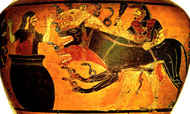 Herakles' third (sometimes considered fourth) labor, pitting the hero against the huge wild boar of Mount Erymanthos. A rare bloodless affair, it required some enticing into open space, chasing in the deep snow, and finally old-fashioned wrestling on Herakles' part. The very sight of the captured but angry beast prompted the wretched and cowardly king Eurystheus to seek last-minute refuge in his bronze jar. However, a large part of the tale of this labor is concerned with a side adventure during the journey to Mt. Erymanthos - the hero's encounter with centaurs in Pholos' cave.